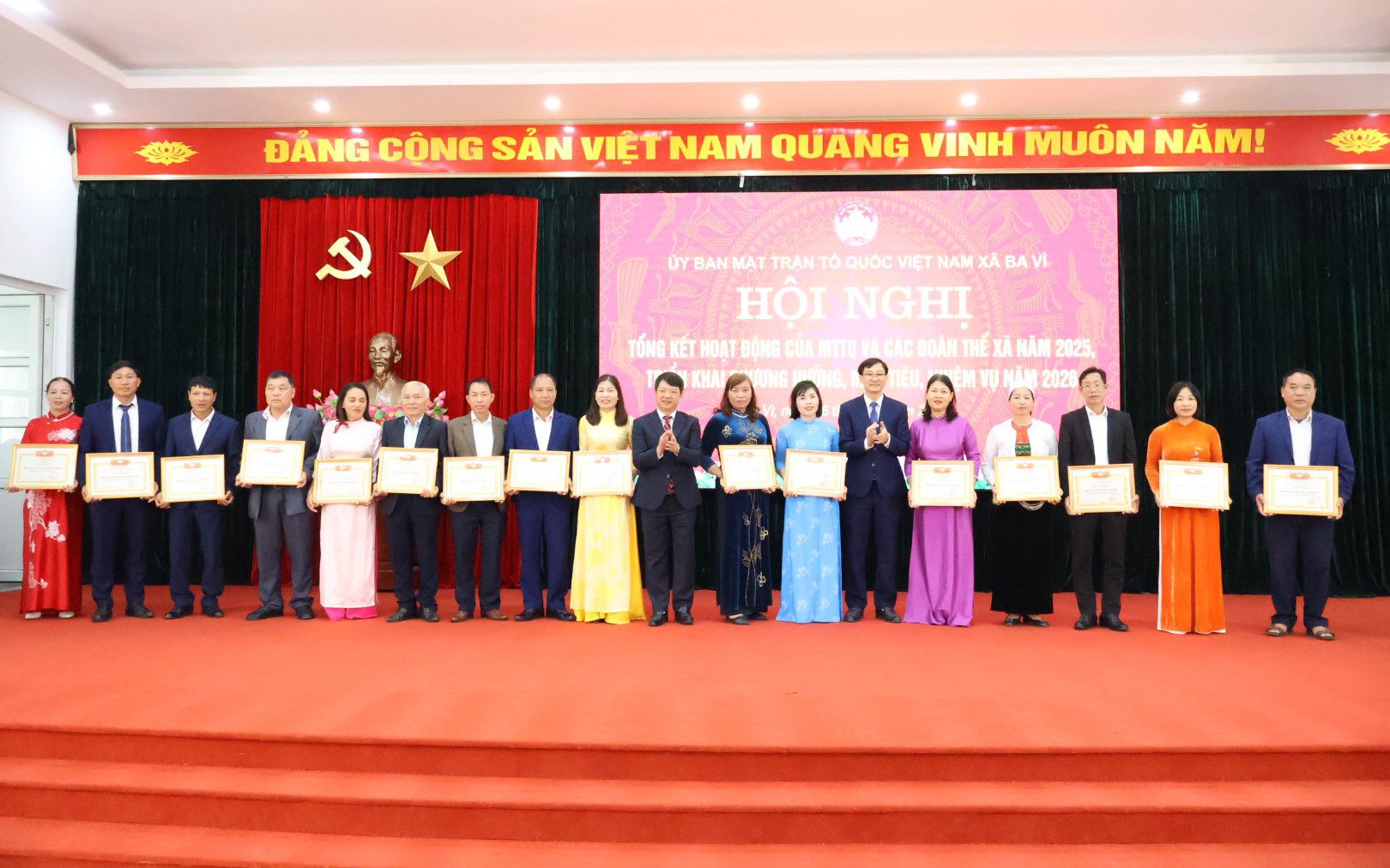 Kết thúc hội nghị, Ủy ban MTTQ Việt Nam xã Ba Vì đã trao giấy khen và bằng khen cho các tập thể, cá nhân có thành tích tiêu biểu trong công tác Mặt trận và phong trào thi đua năm 2025, nhằm kịp thời động viên, khích lệ các điển hình tiên tiến, tạo động lực để tiếp tục hoàn thành tốt nhiệm vụ trong thời gian tới.