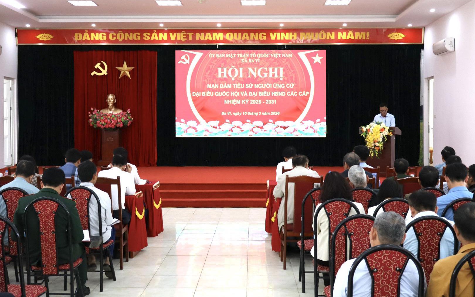Đồng chí Đỗ Văn Minh - Chủ tịch Ủy ban MTTQ Việt Nam xã Ba Vì trình bày tóm tắt tiểu sử những người ứng cử Đại biểu Quốc hội và Đại biểu HĐND các cấp tại hội nghị